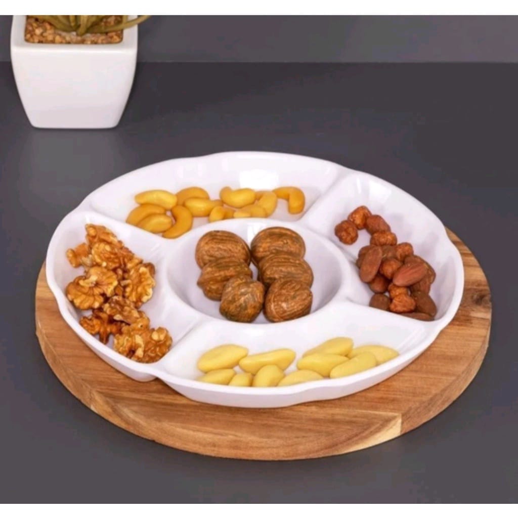 Além de atender aos mais exigentes conceitos de qualidade do mercado com o seu material composto por melamina, possui um design moderno e prático, em formato redondo com cinco divisórias para você complementar a sua mesa e encantar seus convidados com elegância