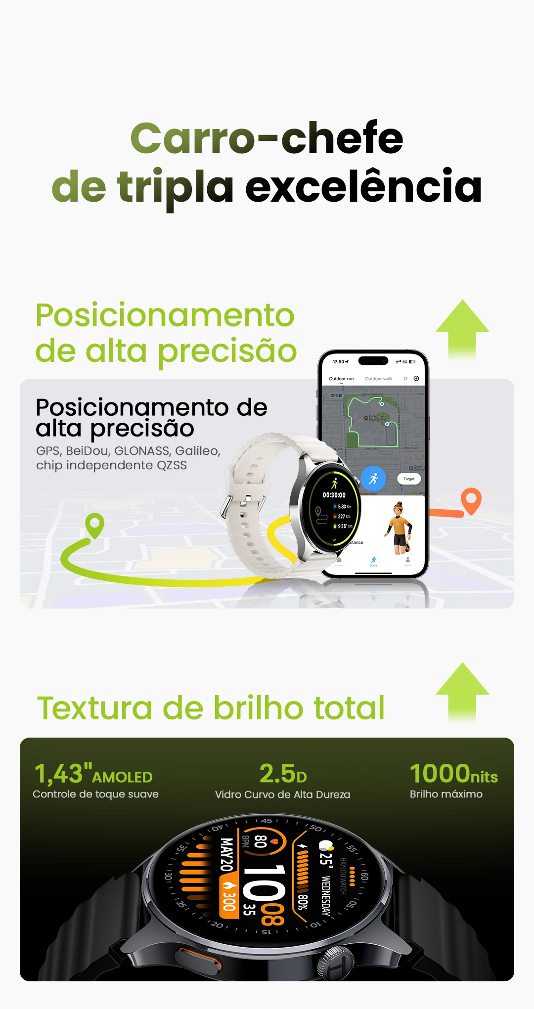 1.43''AMOLEDExibição? Resolução 466*466? 5 Posicionamento GPS por satélite