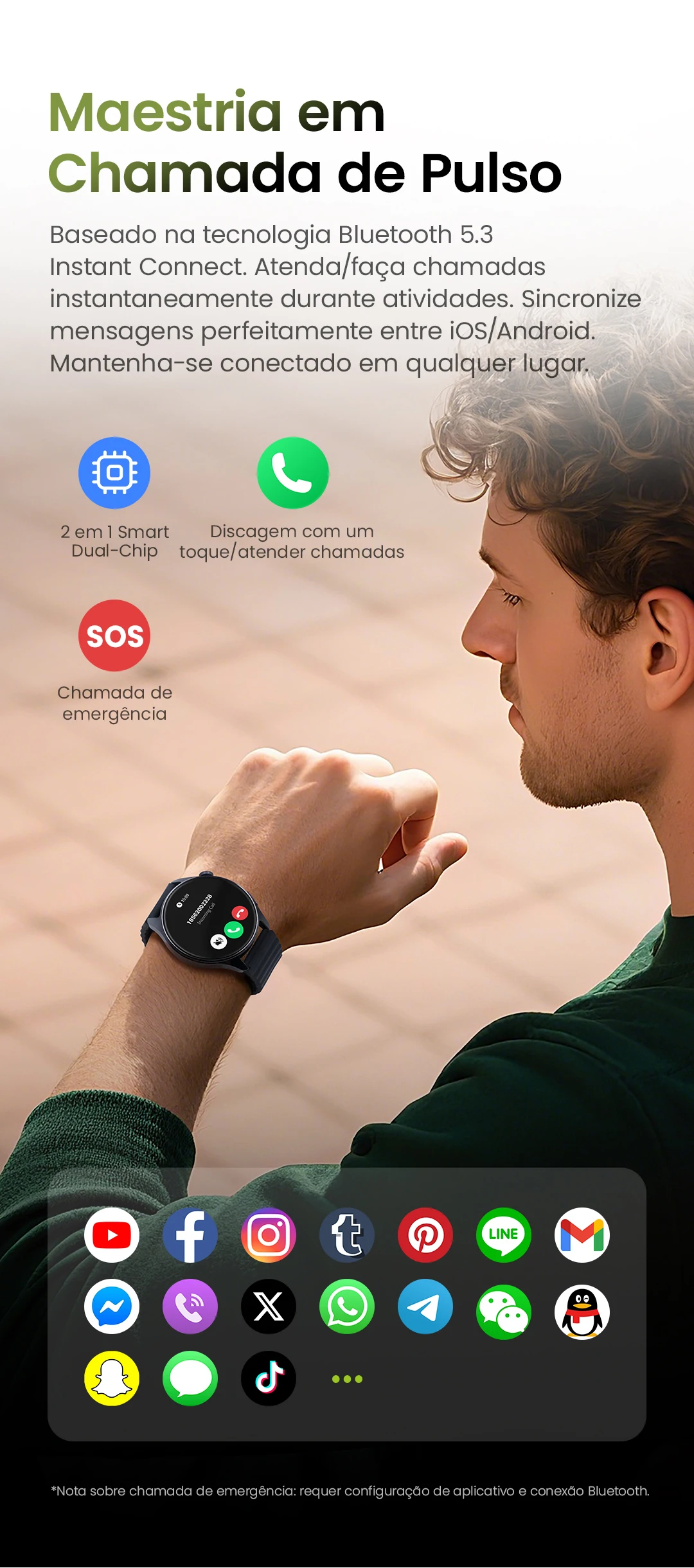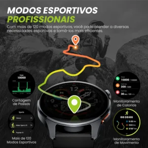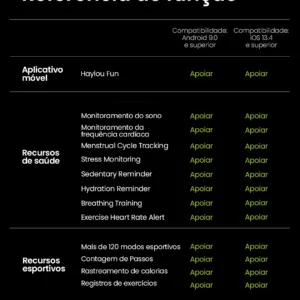 5 Posicionamento GPS por satélite / Chamadas Bluetooth / Fazer/Responder chamadas / Lembrete de chamada recebida / Notificação de mensagem inteligente / Prompt de conexão com um toque / Assistente de voz / Bluetooth 5.3 / Chamada de Emergência SOS / Mais de 120 modos de treino / Rastreamento de calorias / Pedômetro / Lembrete de objetivo alcançado / Gravação de treino / Contagem de passos / Obturador remoto / Sincronização com Strava.