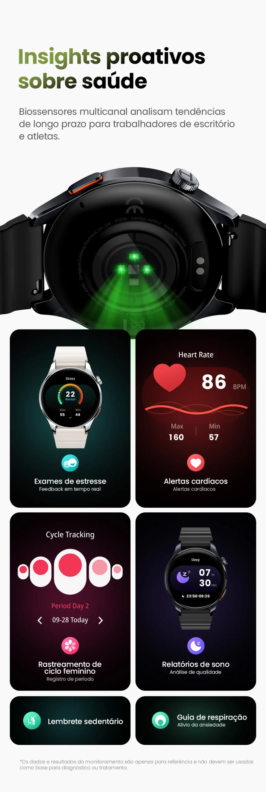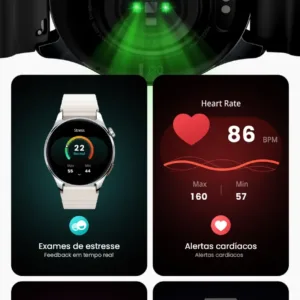 Monitoramento do sono / Monitoramento da frequência cardíaca / Rastreamento do ciclo menstrual / Monitoramento do estresse / Lembrete sedentário / Lembrete de hidratação / Treinamento respiratório / Alerta de frequência cardíaca para exercícios.