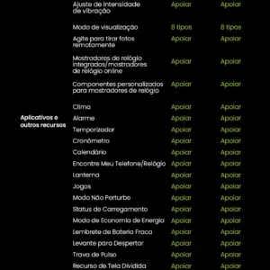 Assistente de voz / Atualizações OTA / Controle de música / Ajuste de intensidade de vibração / Modo Vieww / Agite para tirar fotos remotamente / Mostradores de relógio integrados / Mostradores de relógio on-line / Mostradores de relógio personalizados / Componentes / Weatner / Alarme / Temporizador / Cronômetro / Calendário / Encontre Meu telefone/Relógio/Lanterna/Jogos/Modo não perturbe/Status de carregamento/Modo de economia de energia/Lembrete de bateria fraca/Aumentar para ativar/